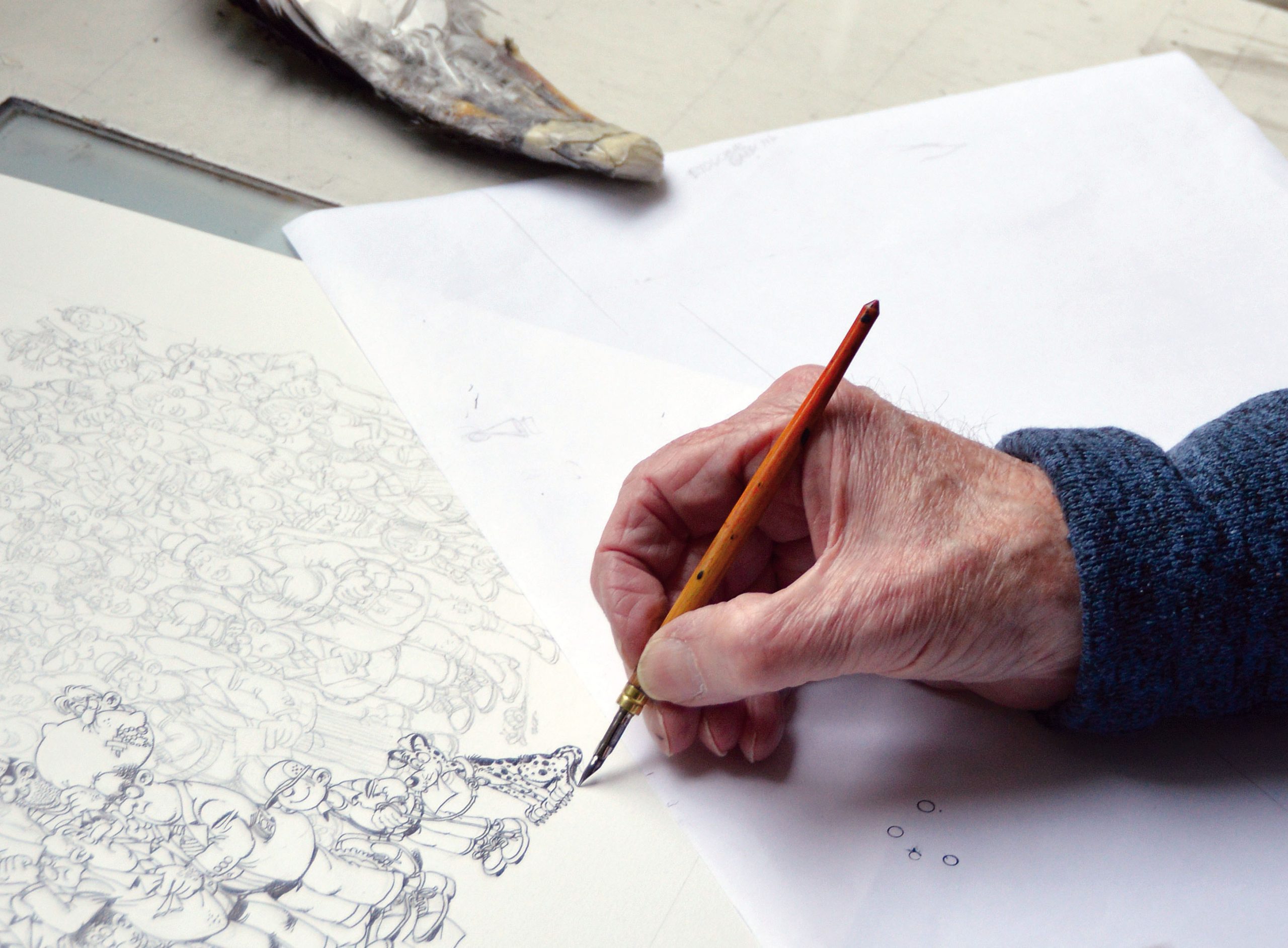 After sketching, the drawing is inked using the finest Rotring pen and then copied at final size. The enlarged sketch is traced again in pencil, and this pencil drawing is then inked with Indian ink and a very fine dip pen.