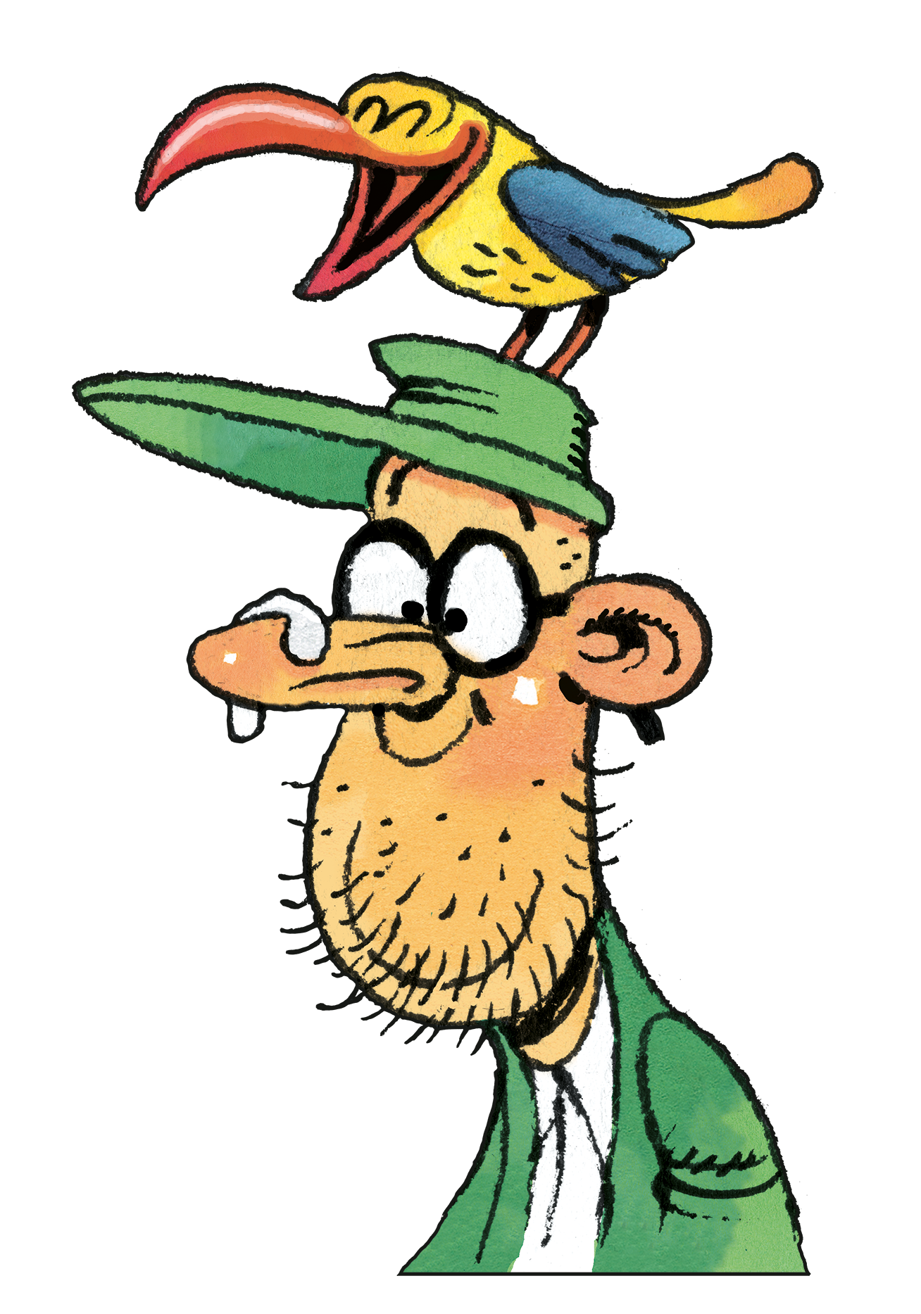 Mars’ puzzles almost always feature a birdwatcher. Often, he is looking for a kingfisher, but other birds such as the heron, raven and cormorant also appear. The Acrobatic Family and Tarzan are other recurring characters in his work.