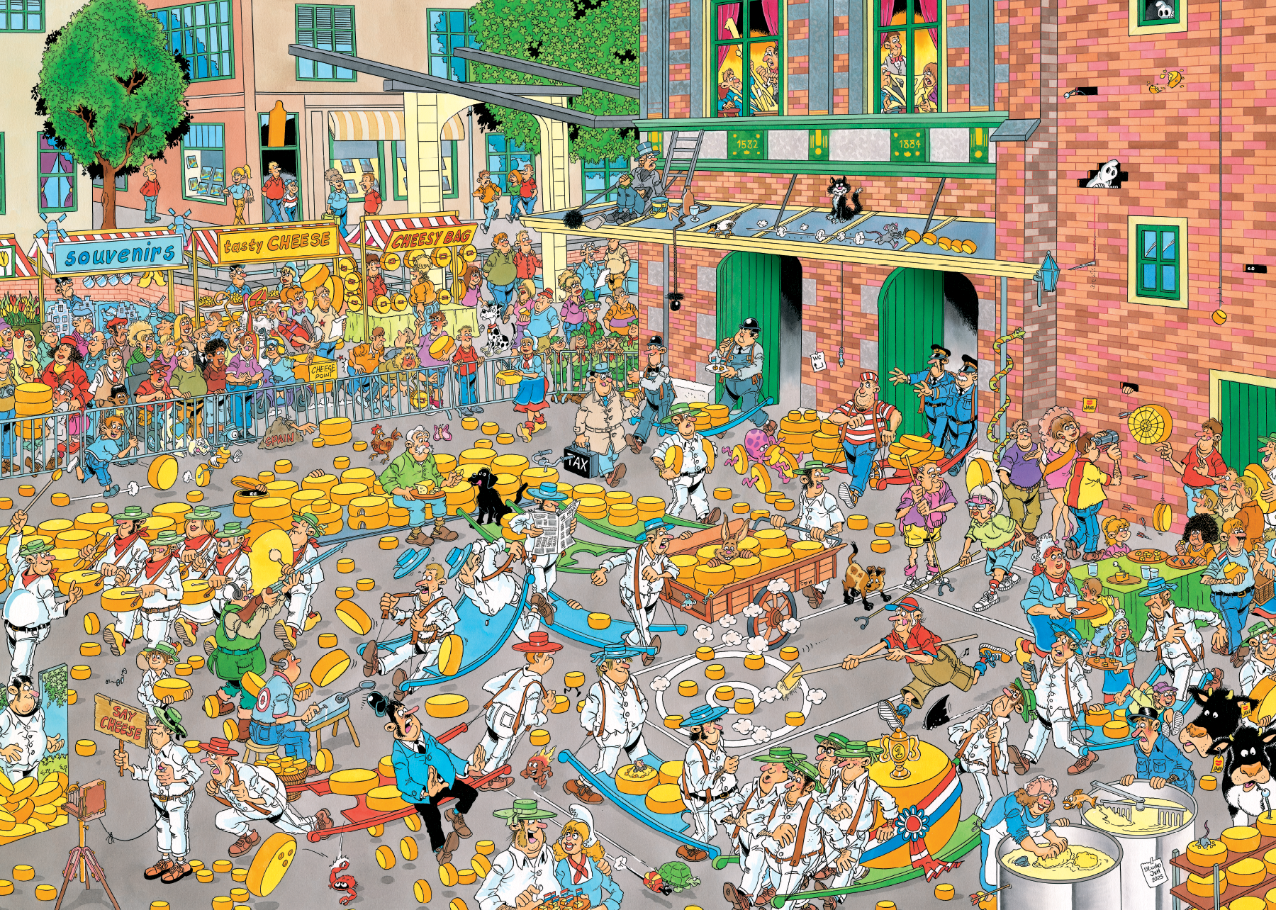 You can visit the Cheese Market in Alkmaar (a city in The Netherlands) twice a week, which is a major tourist attraction and is also popular among the Jan van Haasteren family. It just seems as if Baron van Tast's fantasy has come true this time. Curling on a cheese market, drums made of cheese? It can't get much crazier than that!