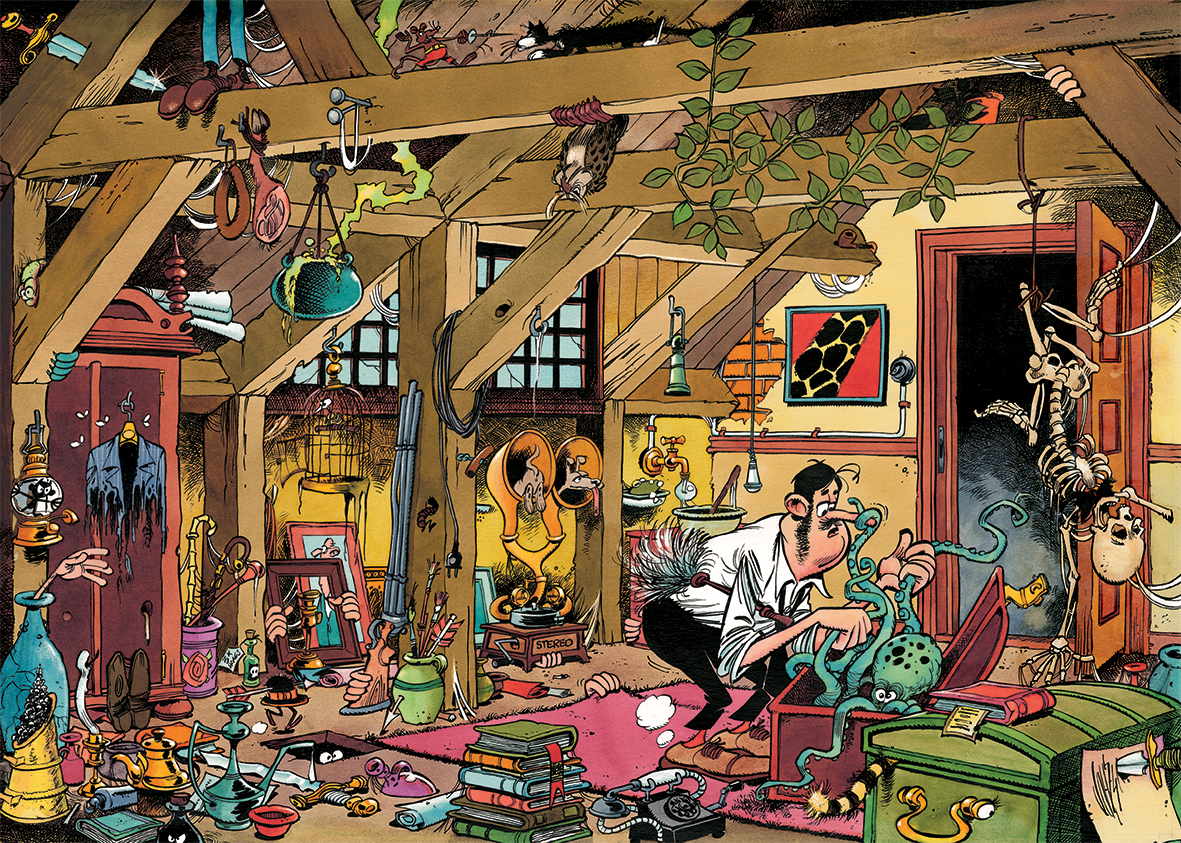 With the Oldtimers series, we look back at the early period of Jan van Haasteren jigsaw puzzles. It’s a little bit of nostalgia and, above all, a tribute to the incredible craftsmanship of Jan van Haasteren. In this puzzle, you get to know “Baron van Tast tot Zeveren”. That was a comic character that Jan van Haasteren used to draw in the past. This drawing was made in 1974. In this puzzle, you can already find a number of recurring elements such as: the arrow, eyes, bullet holes or peepholes, squid, the mouse and the cat, and the well-known little hands.